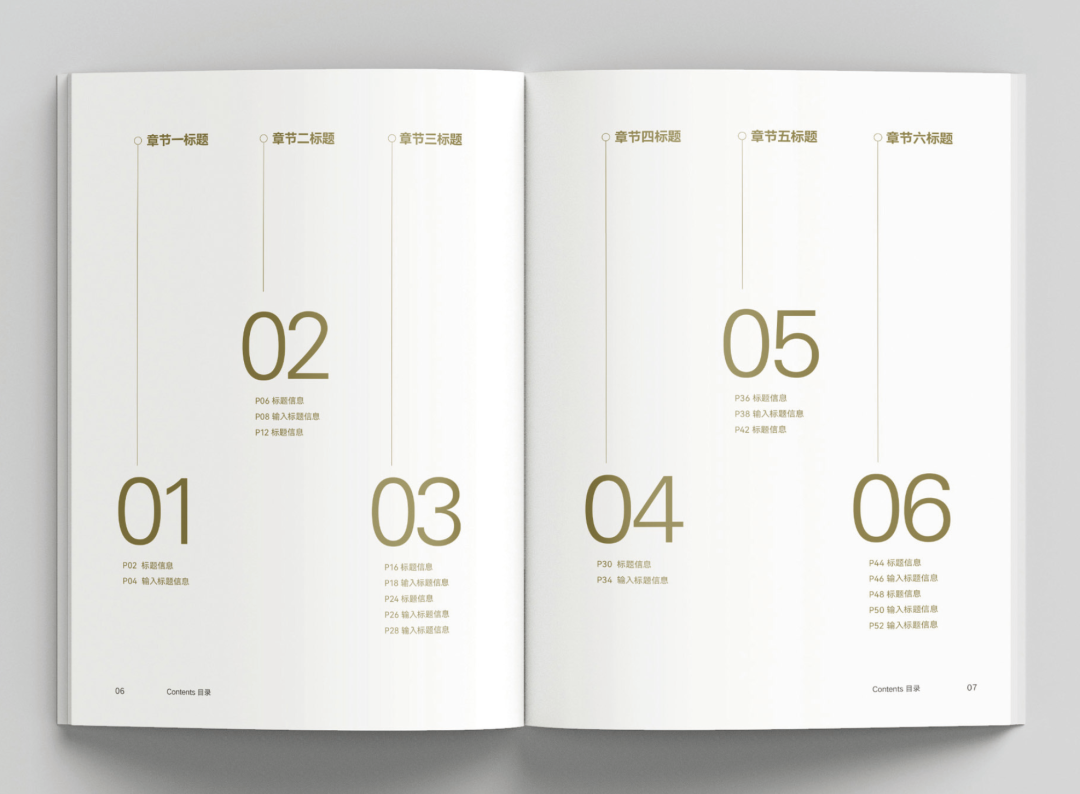 如果畫冊包含大量內容,提供目錄能起到檢索和預覽畫冊內容的功能,有助于讀者快速定位到感興趣的內容。目錄一般被安排在扉頁之后。目錄的設計應當清晰明了、簡潔大氣,并具備正確的視覺引導流程。以下是目錄頁設計的主要編排形式。