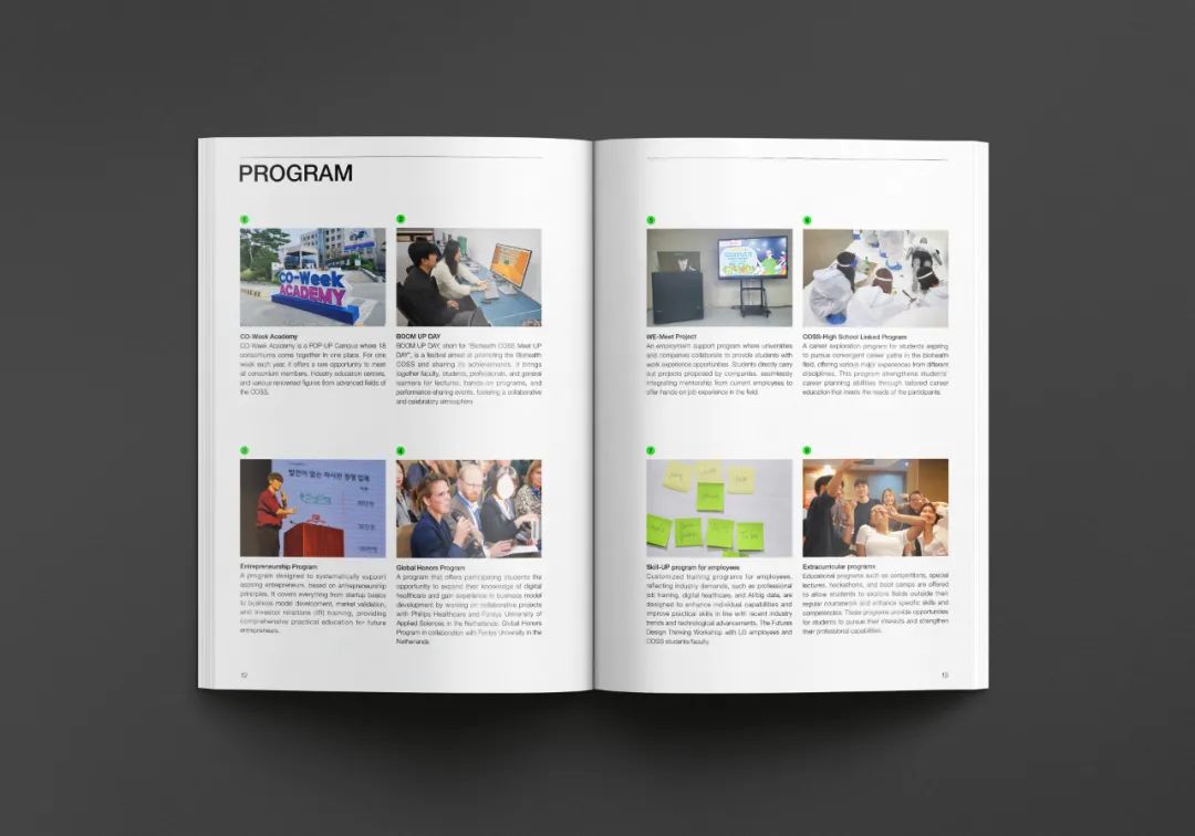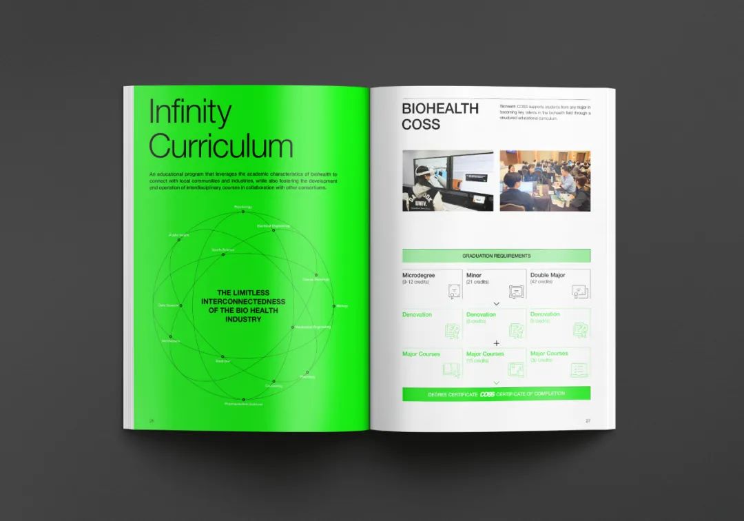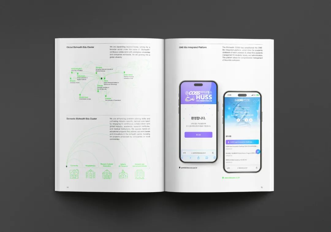 生物健康創新融合大學是通過大學間的融合、開放與合作,旨在國家層面上培養生物健康、人工智能等尖端領域人才的項目。Design Purple 制作了介紹 COSS 圖形開發及項目特點與課程的英文宣傳冊。