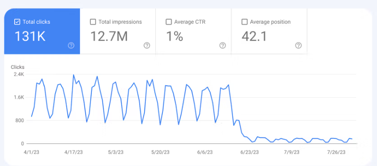 以下是 Google Search Console 性能屏幕的屏幕截圖,顯示點擊次數急劇下降: