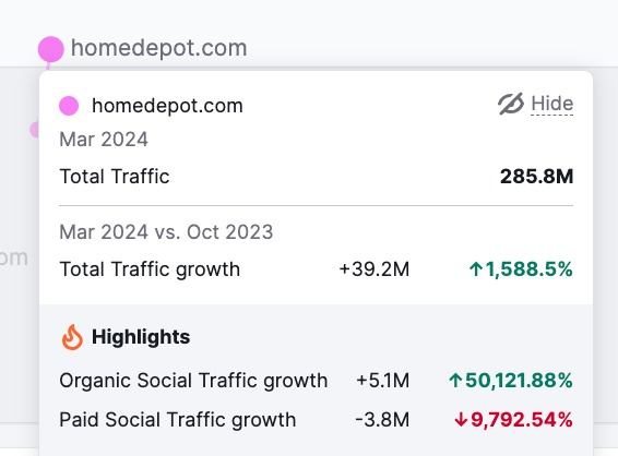 Traffic Analytics中查看流量來(lái)源圖表,觀察自然搜索流量的增長(zhǎng)趨勢(shì)。如果不是一次性的激增,而是有規(guī)律的增長(zhǎng),說(shuō)明homedepot.com在這一渠道上實(shí)施的策略是長(zhǎng)期有效的。