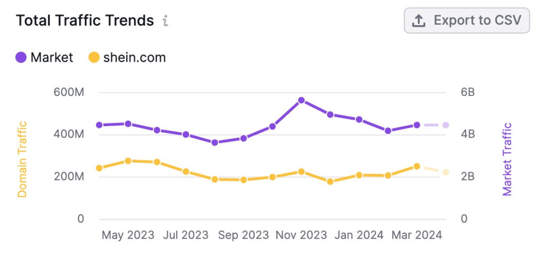 選擇一個(gè)細(xì)分行業(yè)或一批域名,查看Total Traffic Trend(總流量趨勢(shì))圖表,紫色曲線展示了整體市場(chǎng)的流量變化趨勢(shì)。
