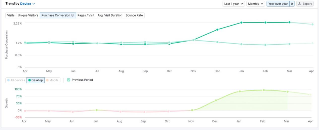在Trend by Device圖表中選擇Purchase Conversion的指標(biāo),觀察過(guò)去一年的轉(zhuǎn)化率變化趨勢(shì)。如果這一趨勢(shì)與流量增長(zhǎng)趨勢(shì)保持一致,表明步驟二中的策略確實(shí)奏效。