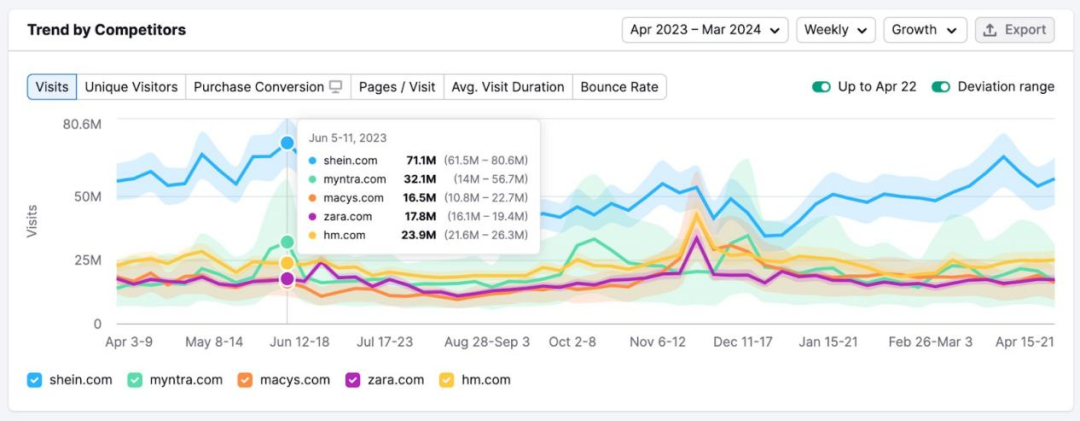 對(duì)市場(chǎng)上的領(lǐng)軍者進(jìn)行調(diào)研,深入了解他們基于市場(chǎng)大環(huán)境而采取的營(yíng)銷策略。在Traffic Analytics中輸入市場(chǎng)上的幾家頭部公司域名,查看Trend by Competitors圖表,了解他們流量的高峰和低谷。