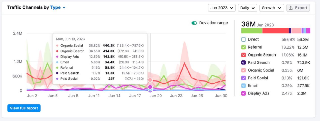 查看Traffic Channels by Type圖表,分析競(jìng)爭(zhēng)對(duì)手流量波動(dòng)的原因。流量飆升可能意味著他們意識(shí)到并抓住了市場(chǎng)機(jī)會(huì),而流量急劇下降可能代表他們的決策出現(xiàn)失誤,或者競(jìng)爭(zhēng)對(duì)手的舉動(dòng)損害了他們的利益。