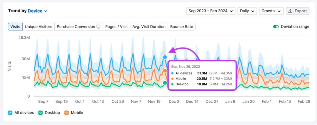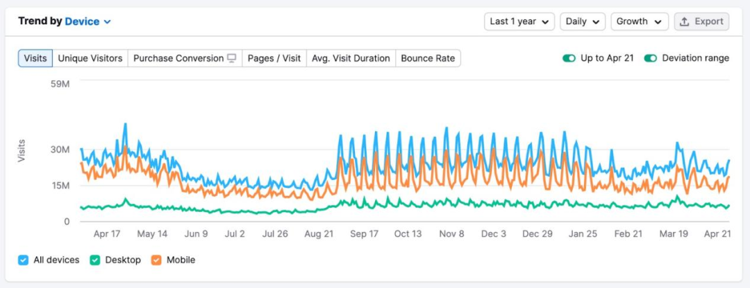 用流量趨勢(shì)圖觀察競(jìng)爭(zhēng)對(duì)手過(guò)去一年的流量趨勢(shì),可以發(fā)現(xiàn)市場(chǎng)中的特殊事件。如果你知道某個(gè)事件即將發(fā)生,那么跟蹤日常流量,了解其變化趨勢(shì)。
