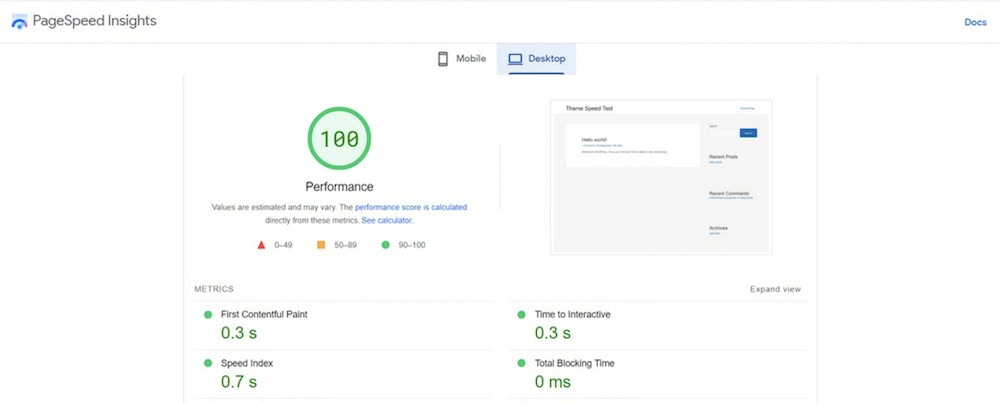 WordPress的Astra主題在PageSpeed Insights上的得分為滿分100,加載時間不到一秒。