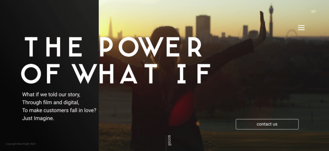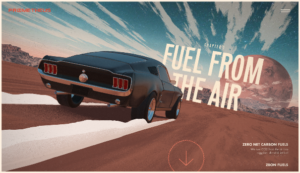 Prometheus Fuels的全屏照片布局是一個優秀案例,圖片與公司業務契合,文案填補了信息空白,導航欄清晰可見,頁面中有一個大箭頭提示用戶向下滾動。