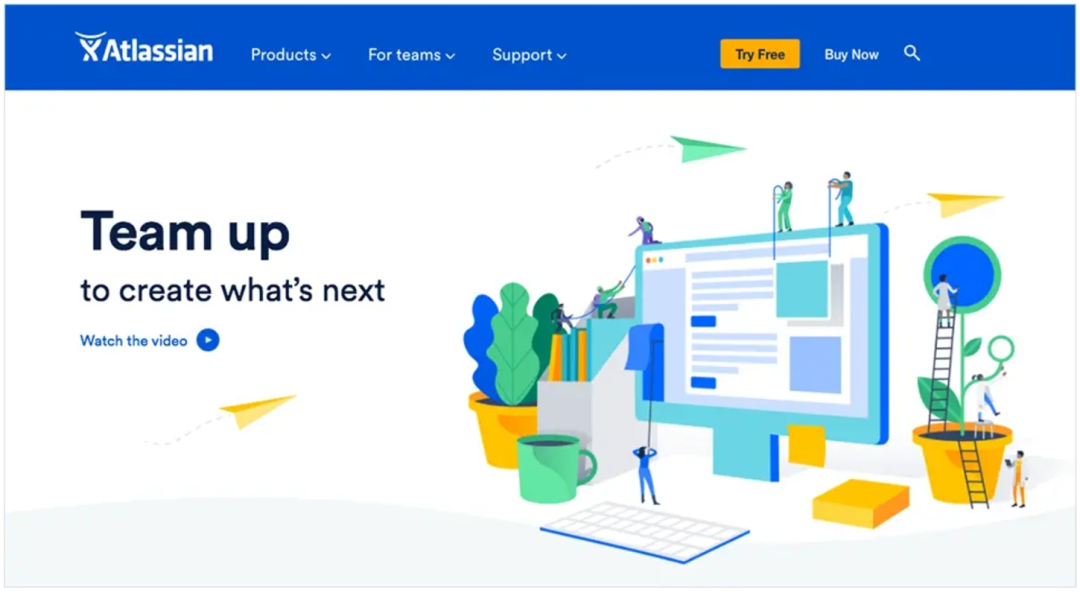 Atlassian用配色明快的圖形插畫描繪了齊心協力的工作場景,烘托出“Team up”的產品價值主張: