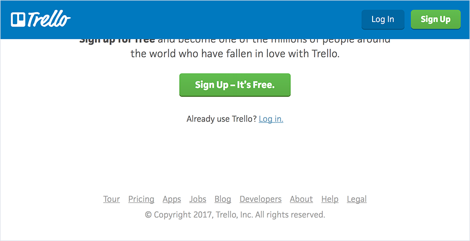 例如辦公協作應用Trelllo的官網頂部沒有導航,只保留了登陸和注冊入口。頁面的信息組織