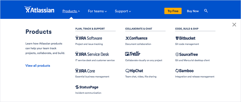再看看Atlassian的設計。到達子產品頁后會保留主導航,隨著頁面滾動,子產品導航會把主導航推出,繼而代替主導航的位置: