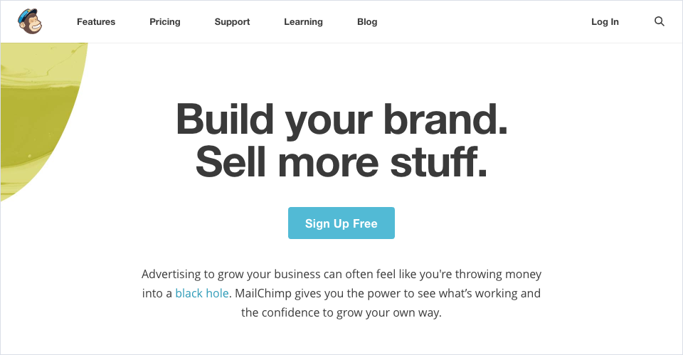 首屏標題是 USP 的核心,簡短明確的標語能起到有力的開場作用。它通常位于官網(wǎng)首屏最顯眼的位置,用大字體突出顯示,還可以用小字輔助說明。例如,MailChimp 的首屏標題簡潔有力: