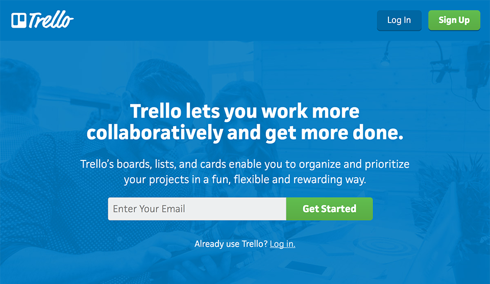 例如辦公協(xié)作應(yīng)用Trelllo的官網(wǎng)頂部沒有導航,只保留了登陸和注冊入口。頁面的信息組織