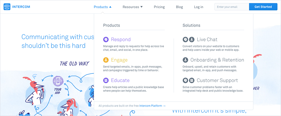 以Intercom為例,它是一款大型CRM應(yīng)用,公司旗下有三大子產(chǎn)品。官網(wǎng)首頁設(shè)置了5個一級導航,其中前兩個是折疊導航。最重要的Products導航的下拉菜單中按照產(chǎn)品和解決方案兩個維度展示了對應(yīng)的信息。配合icon和簡介,有序又直觀: