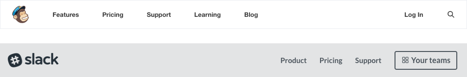 例如企業(yè)郵件應(yīng)用Mailchimp和Slack就是扁平結(jié)構(gòu)的典型代表,它們的導航都只有一級,把所有頁面入口都放在外面,最重要的功能、定價位于前兩個位置,其余的根據(jù)重要性遞減排列,最右邊一般會放注冊或登陸入口: