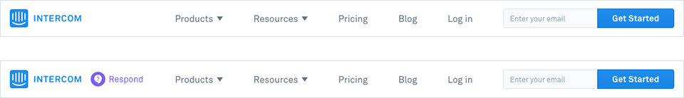 繼續(xù)以Intercom為例,首頁導航在滾動時保持常駐。當點擊首頁導航到達子產(chǎn)品頁面后,導航保持一致,只是在原先的主LOGO旁多了一個子產(chǎn)品LOGO來表明當前所在頁面,點擊主LOGO可以返回首頁: