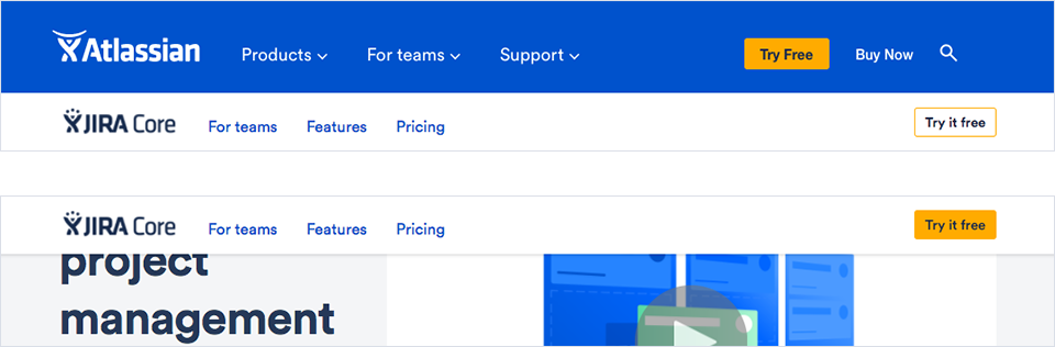 再看看Atlassian的設(shè)計。到達子產(chǎn)品頁后會保留主導航,隨著頁面滾動,子產(chǎn)品導航會把主導航推出,繼而代替主導航的位置: